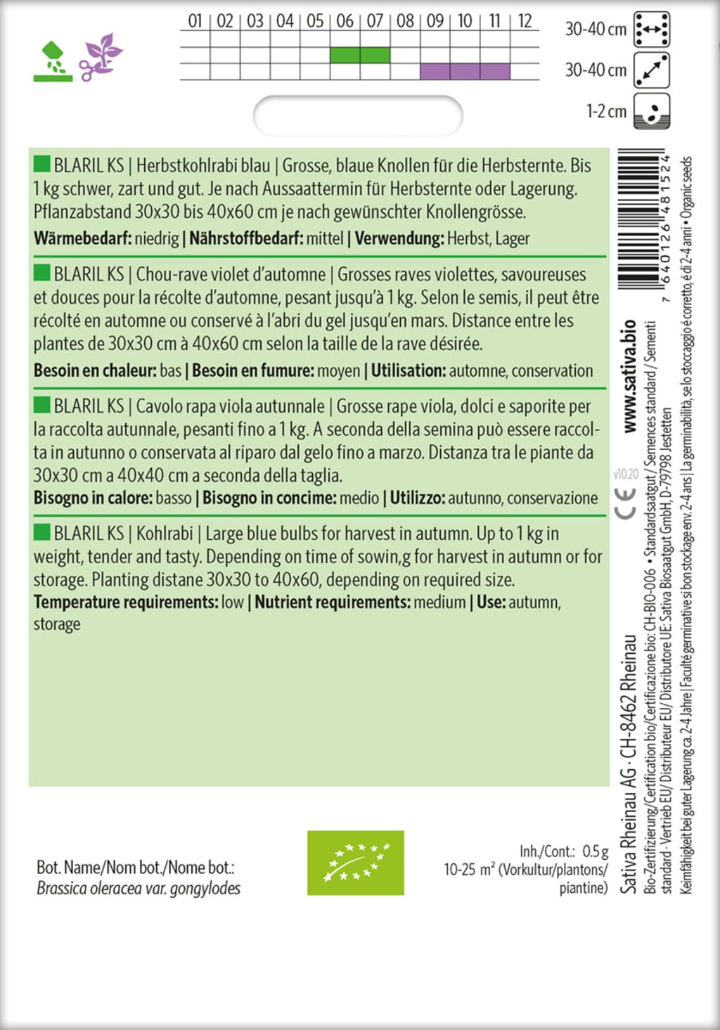 Esta variedad de colinabo forma bulbos grandes y azules que alcanzan un peso de aproximadamente 1 kg y deleitan con su sabor agradablemente tierno. Se cosechan en otoño y se conservan bien.