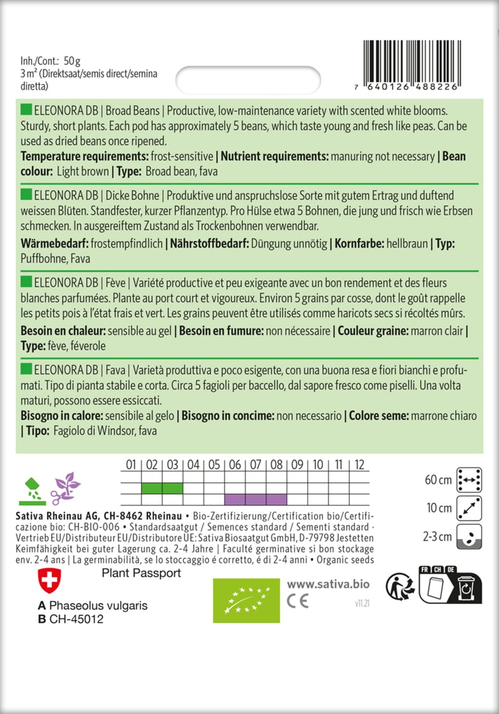 La variedad de haba "Eleonora DB" es relativamente poco exigente y ofrece altos rendimientos. Cada vaina contiene aproximadamente cinco granos, que saben a guisantes cuando están frescos y pueden utilizarse como legumbres secas cuando maduran. Además, esta variedad produce hermosas flores blancas que desprenden una fragancia embriagadora.