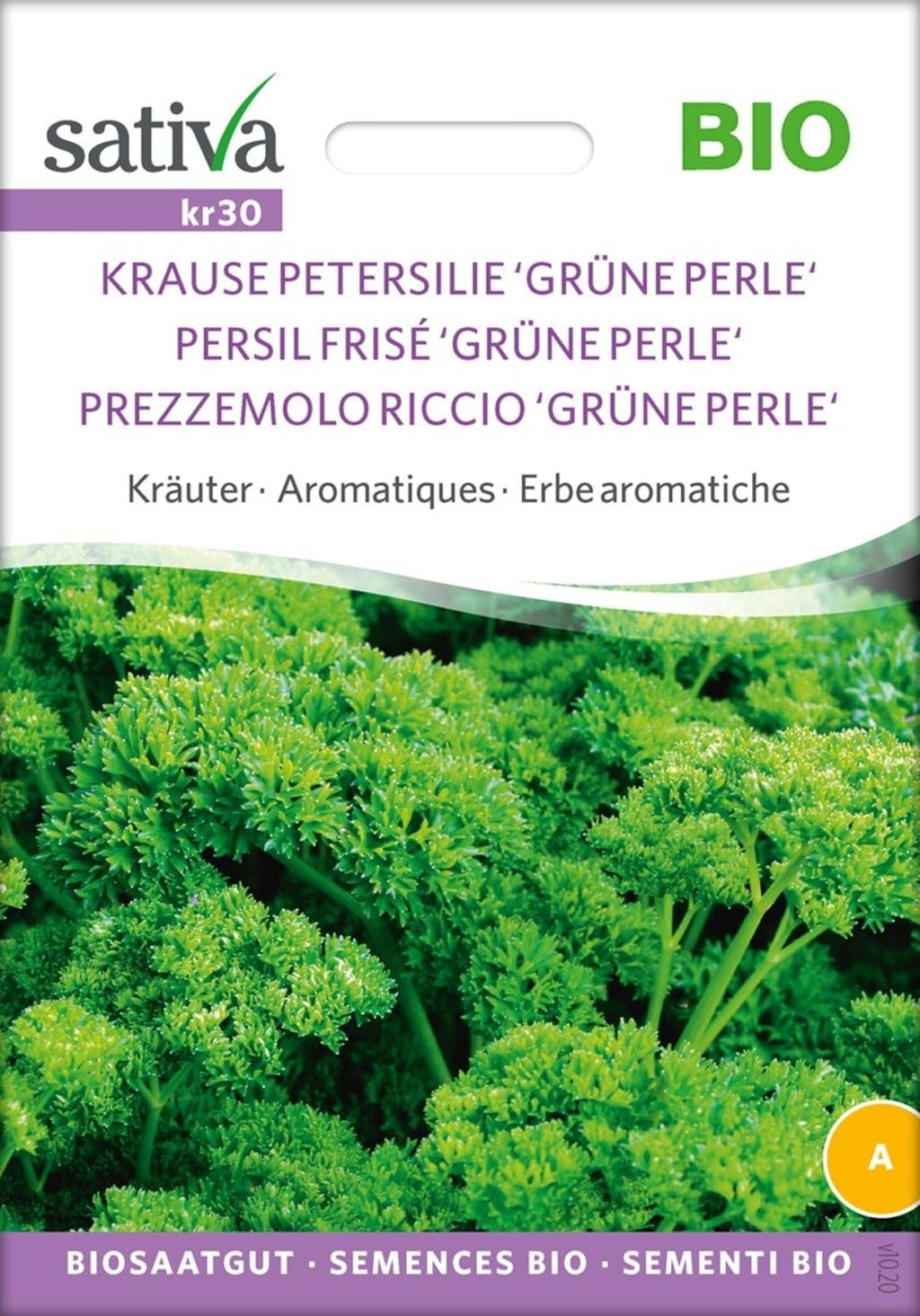 La "Grüne Perle" tiene hojas de color verde oscuro y ligeramente rizadas, ideales para decorar platos y con un sabor suave. Crece rápidamente y de forma abundante. Se puede cosechar durante todo el año y crece sin problemas en parterres, macetas o jardineras.