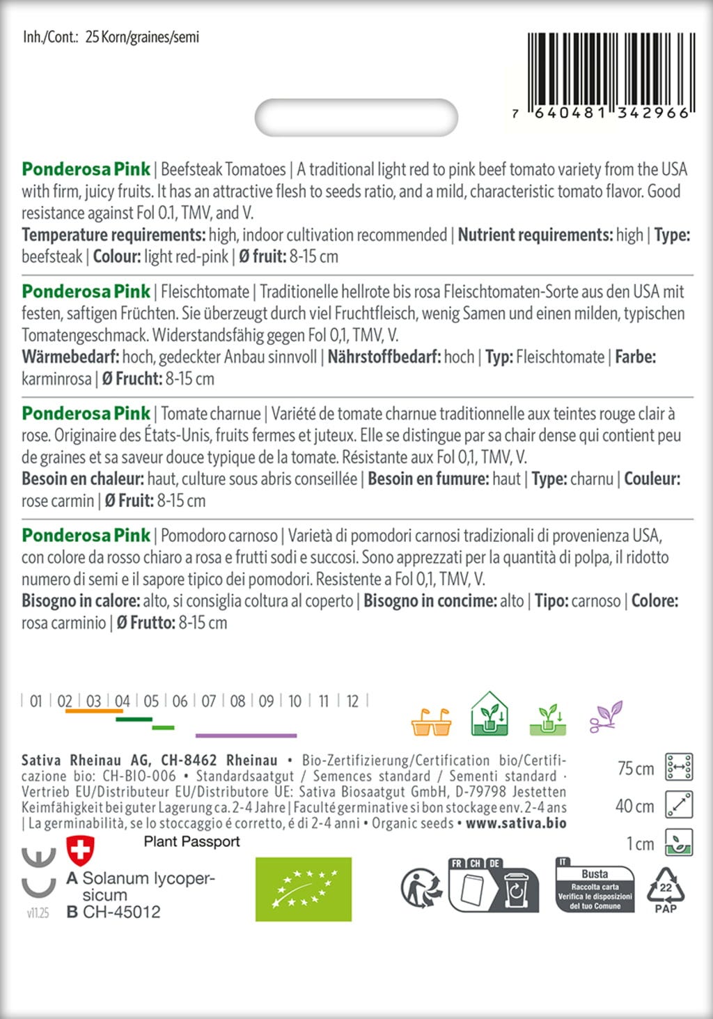 Ponderosa Pink es una variedad tradicional de tomate de carne de los EE. UU. con frutos firmes y jugosos y un suave aroma a tomate. Debido a su alto contenido de pulpa y su buena resistencia, es ideal para el cultivo en el jardín o en el invernadero.