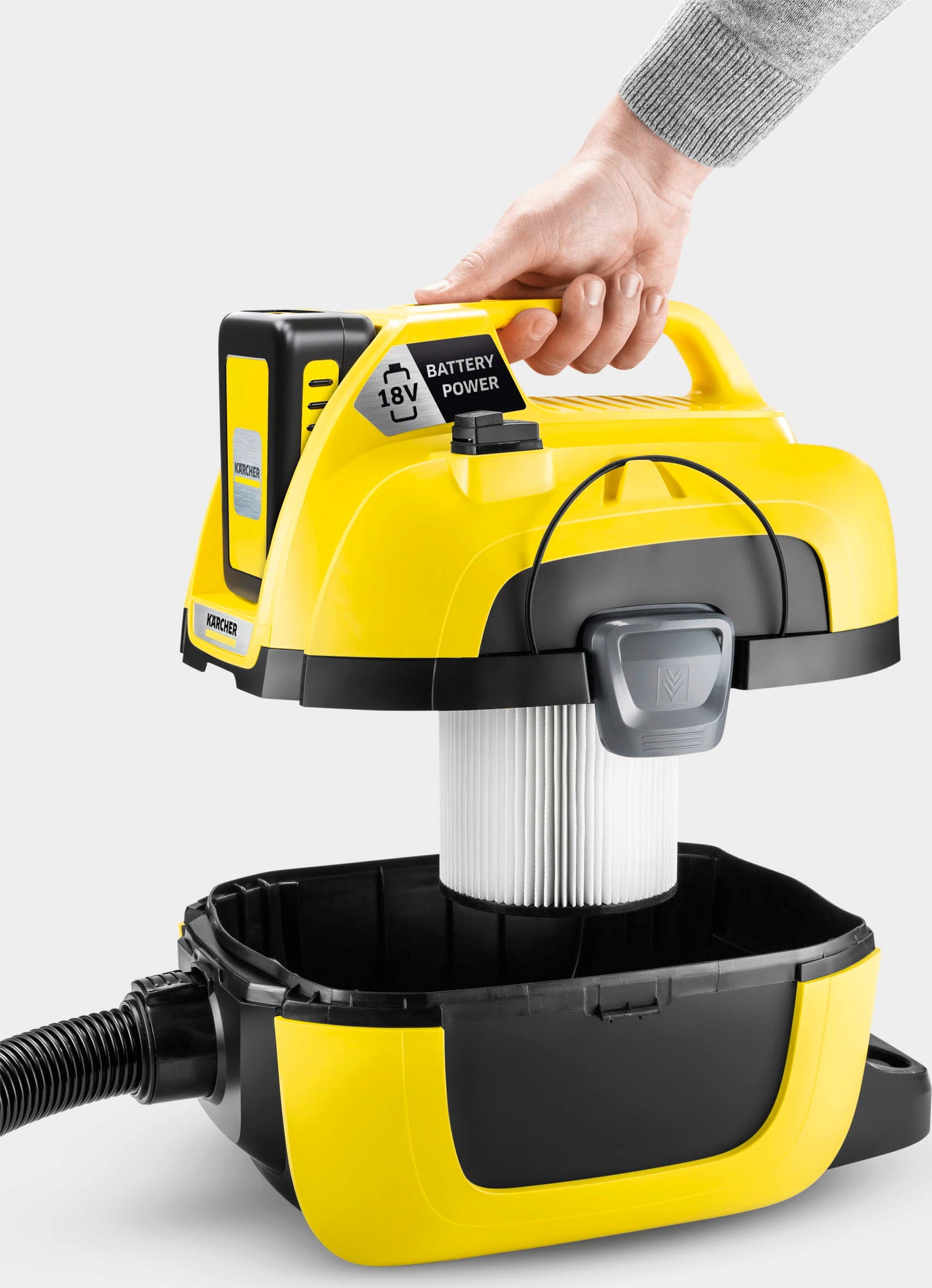 La aspiradora multifunción compacta a batería es ideal para trabajos de limpieza flexibles en casa, en el coche o en pequeñas zonas de trabajo. Gracias al funcionamiento con la plataforma de batería Battery Power de 18 V, el equipo funciona completamente sin cable y puede utilizarse también donde no haya una toma de corriente disponible, por ejemplo en una caseta de jardín, en el garaje, en pequeñas obras o durante trabajos de reforma.