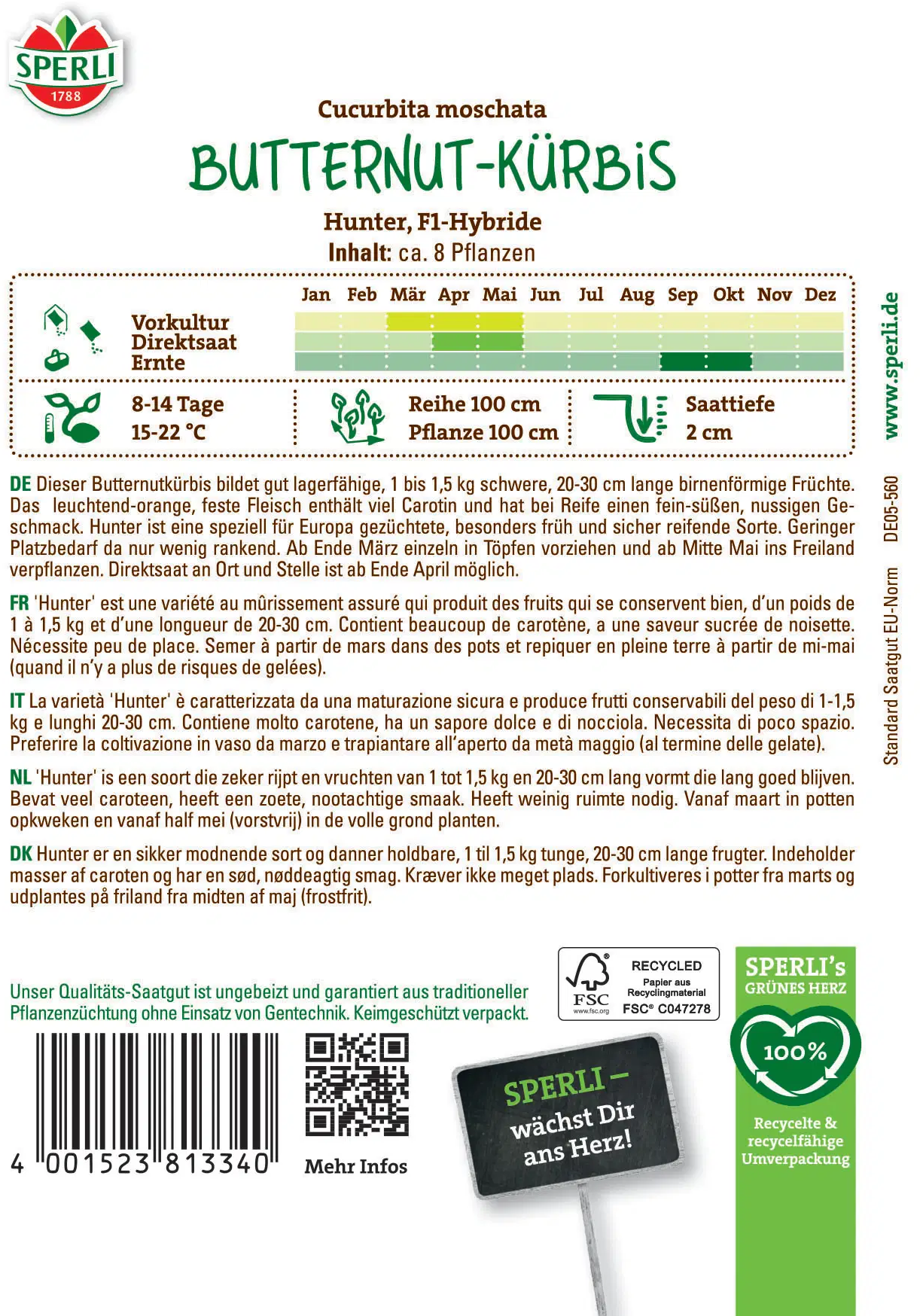 La calabaza moscada 'Hunter' deleita con su dulce sabor a nuez y sus frutos de color naranja brillante. Perfecta para sopas, guisos o pan de calabaza: resistente, fácil de cuidar e ideal para los amantes de la jardinería que desean disfrutar de una calabaza aromática directamente de su huerto.