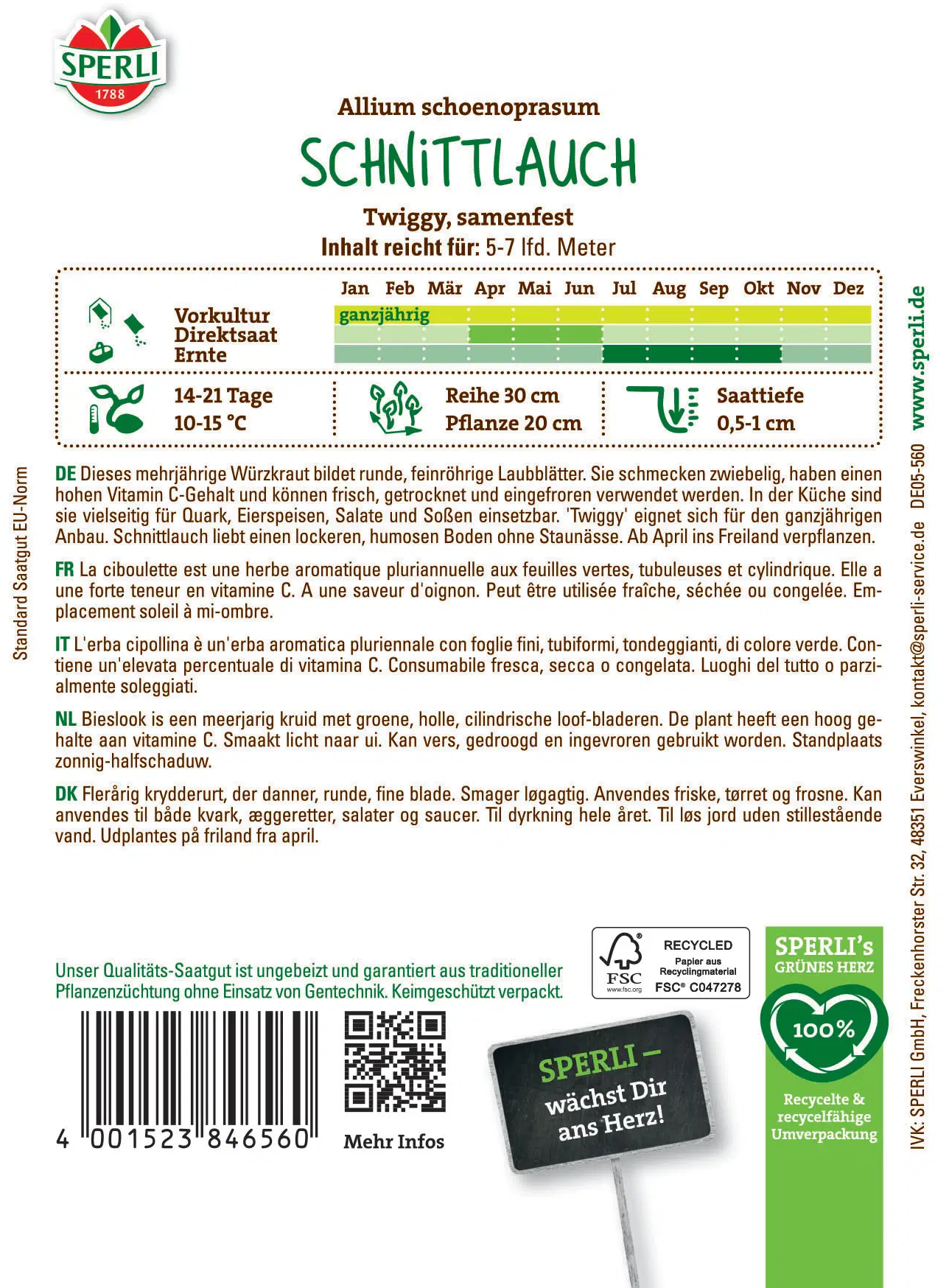 El cebollino 'Twiggy' de Sperli es una hierba aromática perenne ideal para macetas o parterres. Sus finas hojas tubulares verdes tienen un sabor fresco a cebolla y son ricas en vitamina C, perfectas para ensaladas, salsas o sobre pan. Twiggy crece de forma fiable en lugares soleados o de semisombra y puede sembrarse en macetas durante todo el año o al aire libre de abril a junio. La época de cosecha es entre julio y octubre.