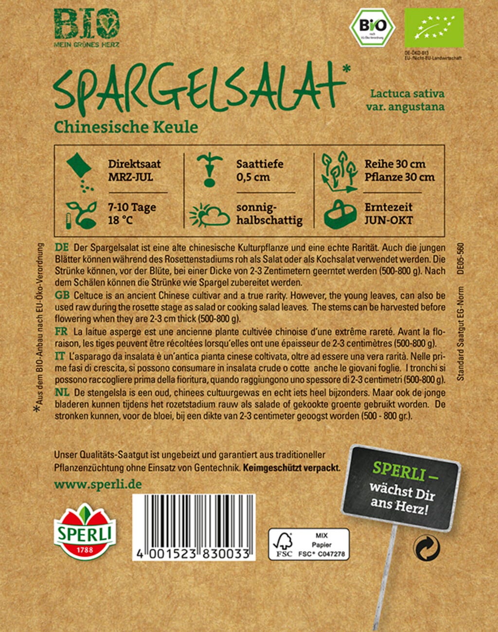 Hortaliza de tallo exótica que puede utilizarse de múltiples formas. Los tallos de la lechuga espárrago pueden cosecharse y cocinarse antes de la floración. Las hojas jóvenes también son aptas para el consumo, ya sea crudas o cocinadas. Un delicioso placer veraniego.