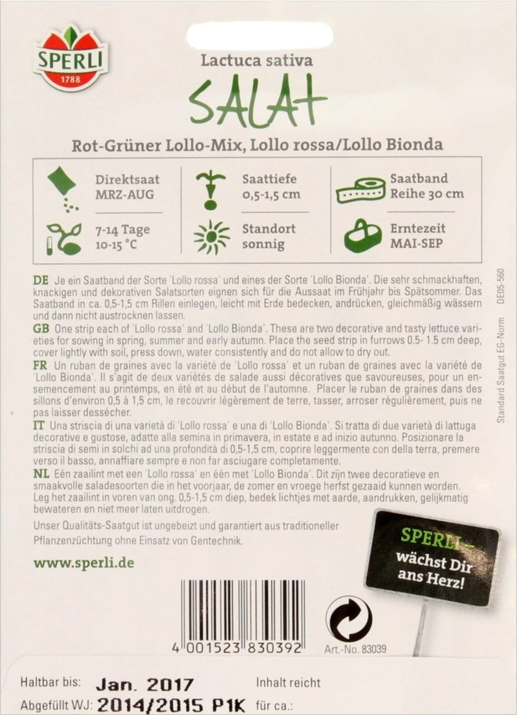 Sperli Mezcla de lechugas "Lollo-Mix" cinta de semillas de 5 m