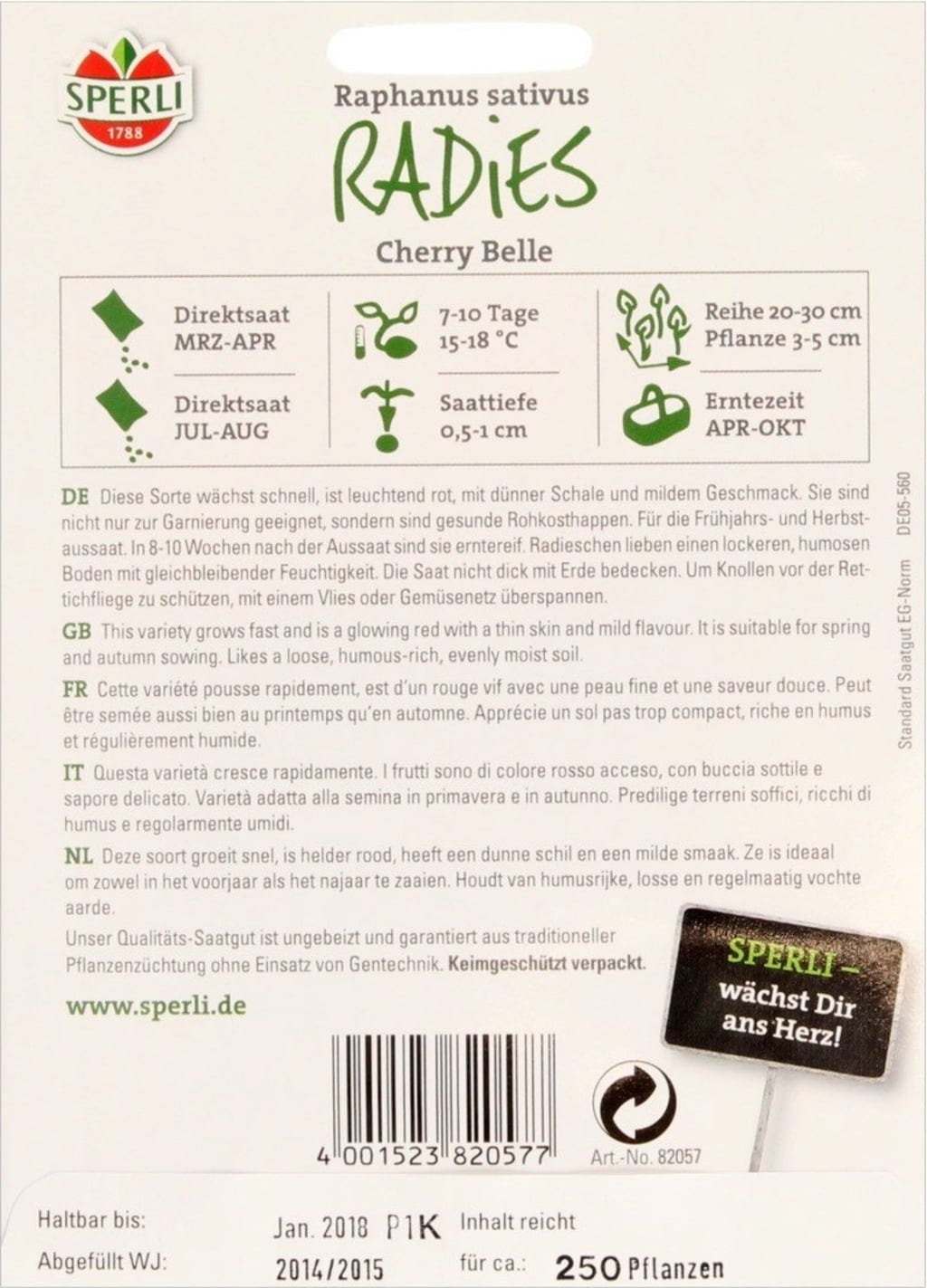 Cherry Belle es un rabanito de exterior de crecimiento rápido y apto para el forzado, con una piel fina de color rojo brillante y un sabor suave. Una variedad probada para primavera y otoño. Su uso es sumamente versátil, por ejemplo, para decorar platos, en ensaladas, como crudités, en sopas o como acompañamiento en el pan.