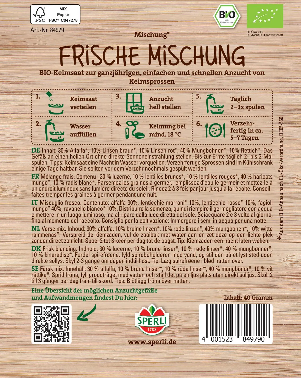Esta colorida mezcla de germinados ecológicos aporta un sabor fresco a tu plato y convierte visualmente cada comida en un verdadero espectáculo. El cultivo es muy sencillo en el alféizar de la ventana y, tras unos cinco a siete días, ya puedes cosechar los primeros brotes.