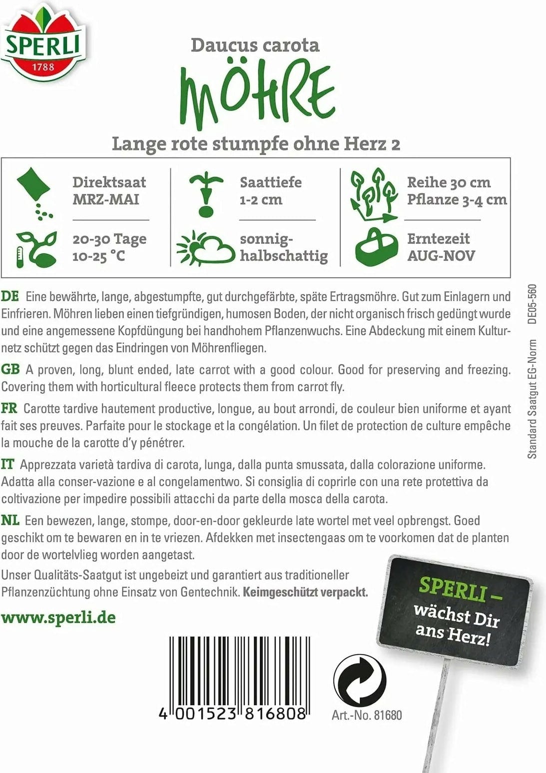 Sperli Semillas de zanahoria "Lange rote stumpfe ohne Herz 2"