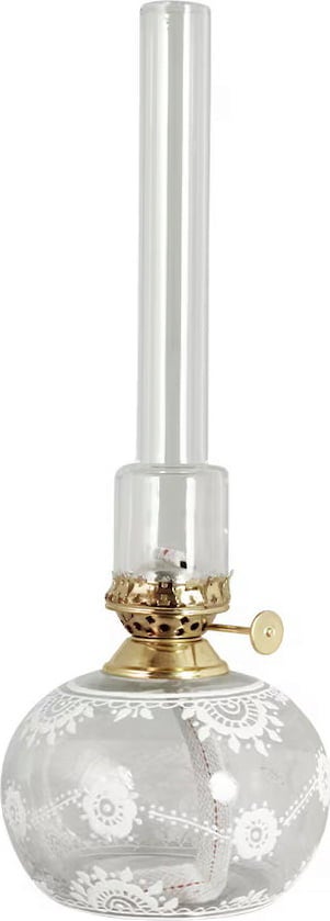 La lámpara de parafina ovalada Marja combina la elegancia nostálgica con un toque moderno. El cristal transparente redondo está hábilmente decorado con delicadas flores y se complementa con un refinado quemador de latón y un tubo de cristal. Proporciona a cualquier habitación un cálido y romántico resplandor y es perfecta tanto para interiores clásicos como modernos.