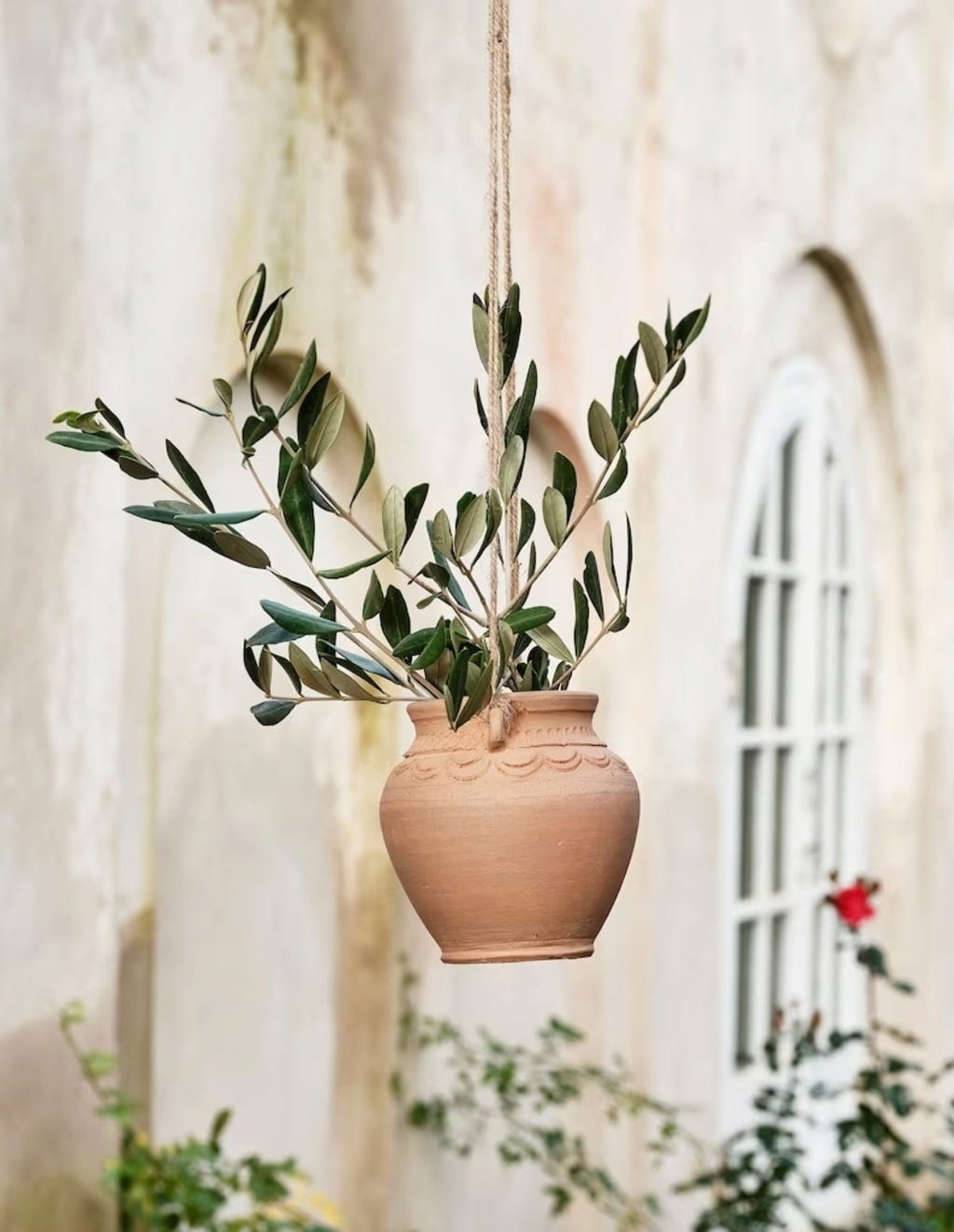 Maceta de barro hecha a mano con cordón de yute para colgar. Gracias a su tallado decorativo, este recipiente se convierte en un elemento destacado para zonas exteriores.