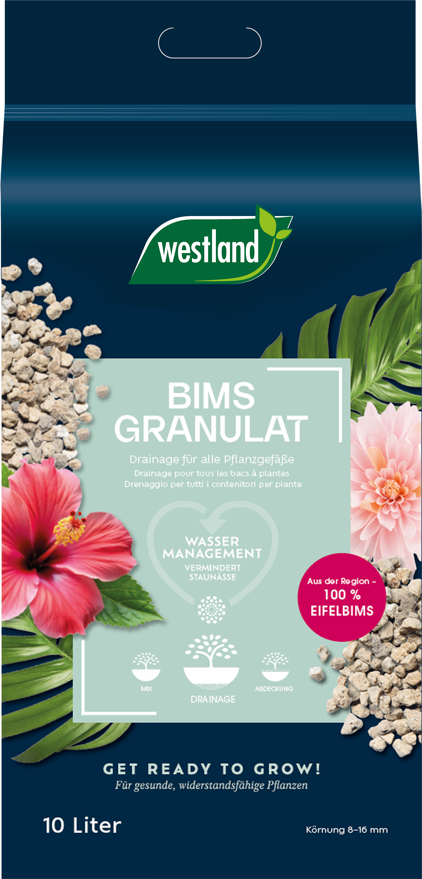 Este granulado consiste en piedra pómez natural y porosa procedente de la región de Eifel, ideal como capa drenante en macetas.