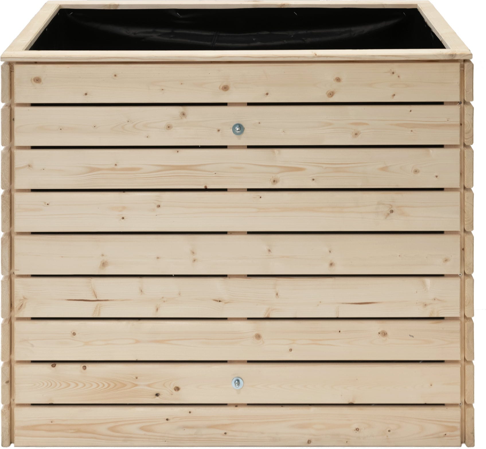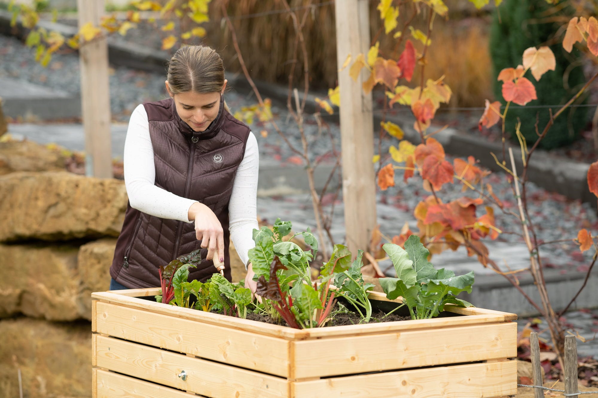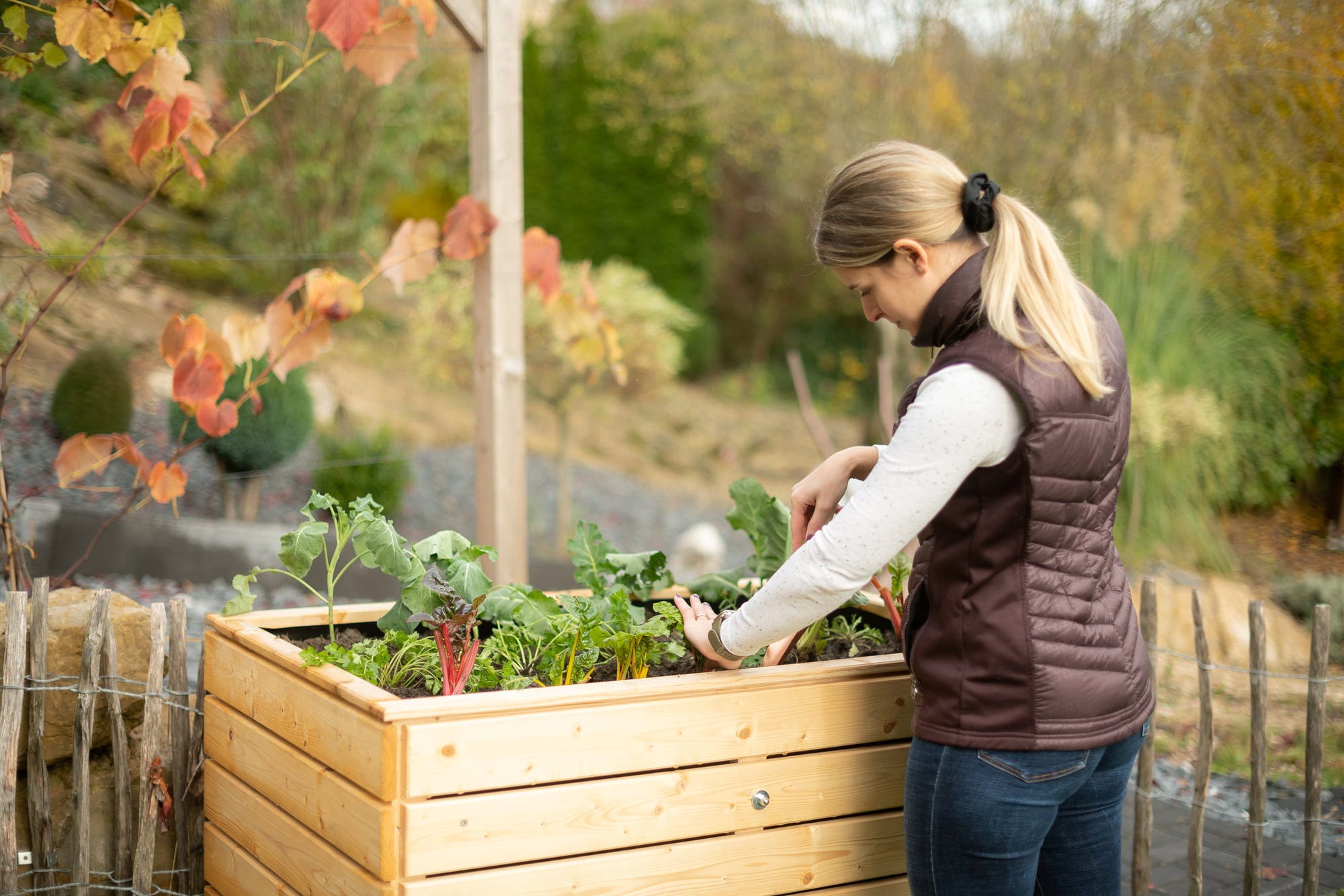 Con este huerto elevado de abeto local, la jardinería resulta especialmente divertida, ya que la agradable altura de trabajo cuida la espalda, permitiendo realizar tareas prolongadas con facilidad. También se disfruta de esta ventaja durante la cosecha, evitando por completo tener que agacharse al recoger pimientos o cortar lechugas. Con su diseño moderno, el huerto elevado no solo atrae todas las miradas en el jardín, la terraza o el balcón, sino que también puede utilizarse como un límite decorativo para la propiedad.
